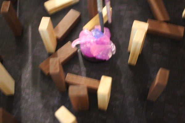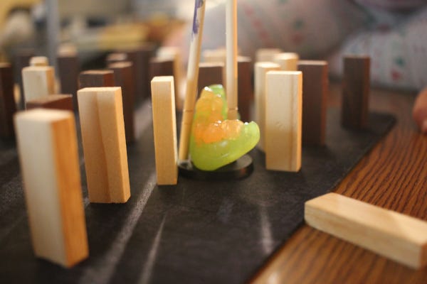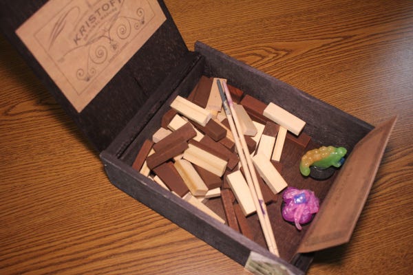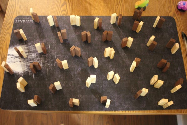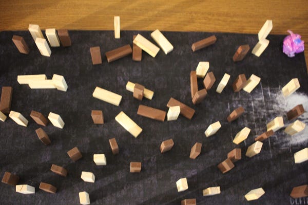 For buildings, we’re using blocks from a small sized totally-not-Jenga-why-would-you-even-think-that set I picked up at the dollar store, and our playmat is just a standard 14x24 inch TCG playmat. A timer, and a couple of chopsticks (mine have paint on them because I used them as stirring sticks) and we were off to the races.